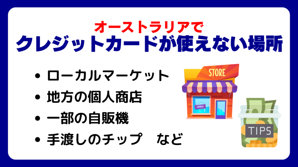 一方で、オーストラリア国内の以下のような場所ではクレジットカードが使えないケースもあります。