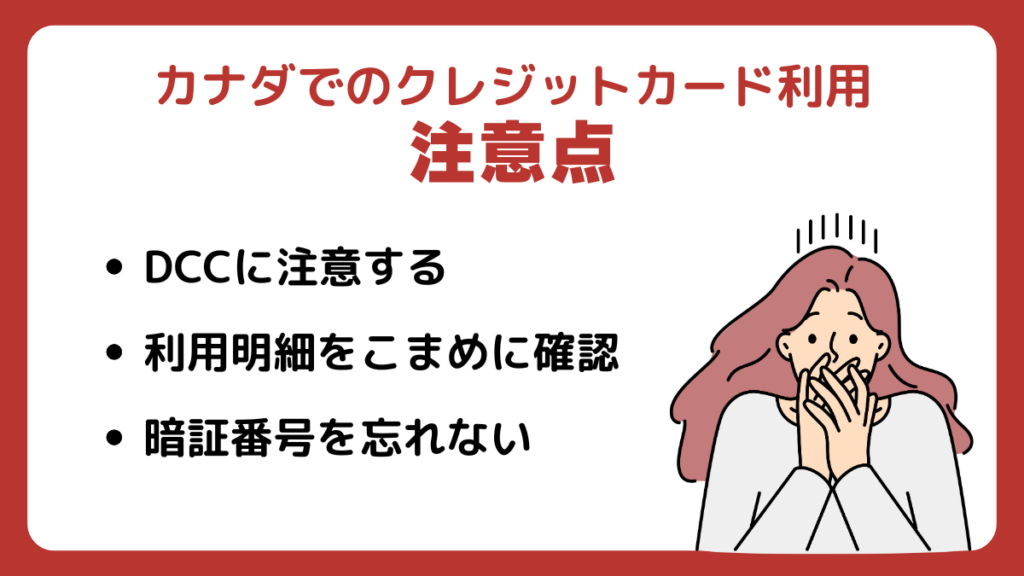 海外でのクレジットカード利用では、不正利用のリスクが国内よりも高くなる傾向があります。カナダ渡航中も、定期的にカード会社のウェブサイトやスマートフォンアプリで利用明細をチェックしてください!