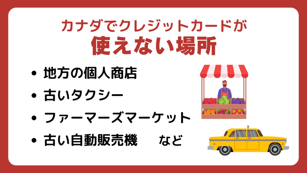 カナダはキャッシュレス化が進んでいるものの、すべての場所でクレジットカードが使えるわけではありません。たとえば上に挙げたような地方の家族経営の店や観光地ではない地域の露店などでは、カード決済に対応していないケースもあります。