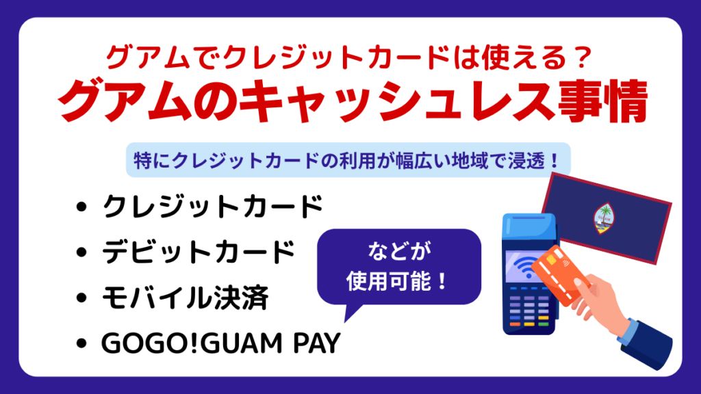 グアムは日本からのアクセスがよく、観光や出張で訪れる人が多い旅行地です。アメリカ準州であるため、キャッシュレス決済が非常に普及していて、クレジットカードを持っていないと不便な場面が多いです。