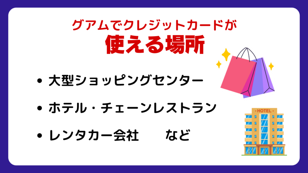 観光地であるグアム中心部では、ホテル・レストラン・ショッピングモール(マイクロネシアモールやJPスーパーストア)・大手チェーンのコンビニ・レンタカー会社などで広く利用できます。旅行者が滞在中にクレジットカードでの支払いに困る場面はほとんどありません。