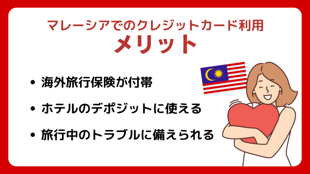 マレーシア旅行でクレジットカードを携行する最大のメリットは、海外旅行保険が付帯されている点です。多くのクレジットカードには海外旅行時のケガ・病気の治療・携行品の破損・航空機の遅延などによる損害をカバーする保険が付いていて、万が一の際の心強い味方です。