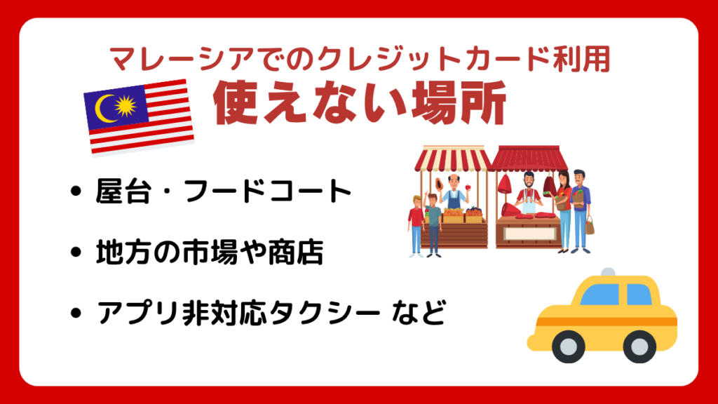 一方でマレーシアではクレジットカードが使えない場所が未だにあることも理解しておくようにしましょう。マレーシアでクレジットカードカードが使えない可能性がある施設は主に以下の通りです。
