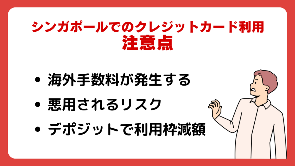 クレジットカードは非常に便利な一方で、為替手数料や不正利用、デポジットによる利用枠の確保など、注意すべき点もあります。ここでは、シンガポールでのクレジットカード利用前に知っておきたいリスクや対策について解説します。